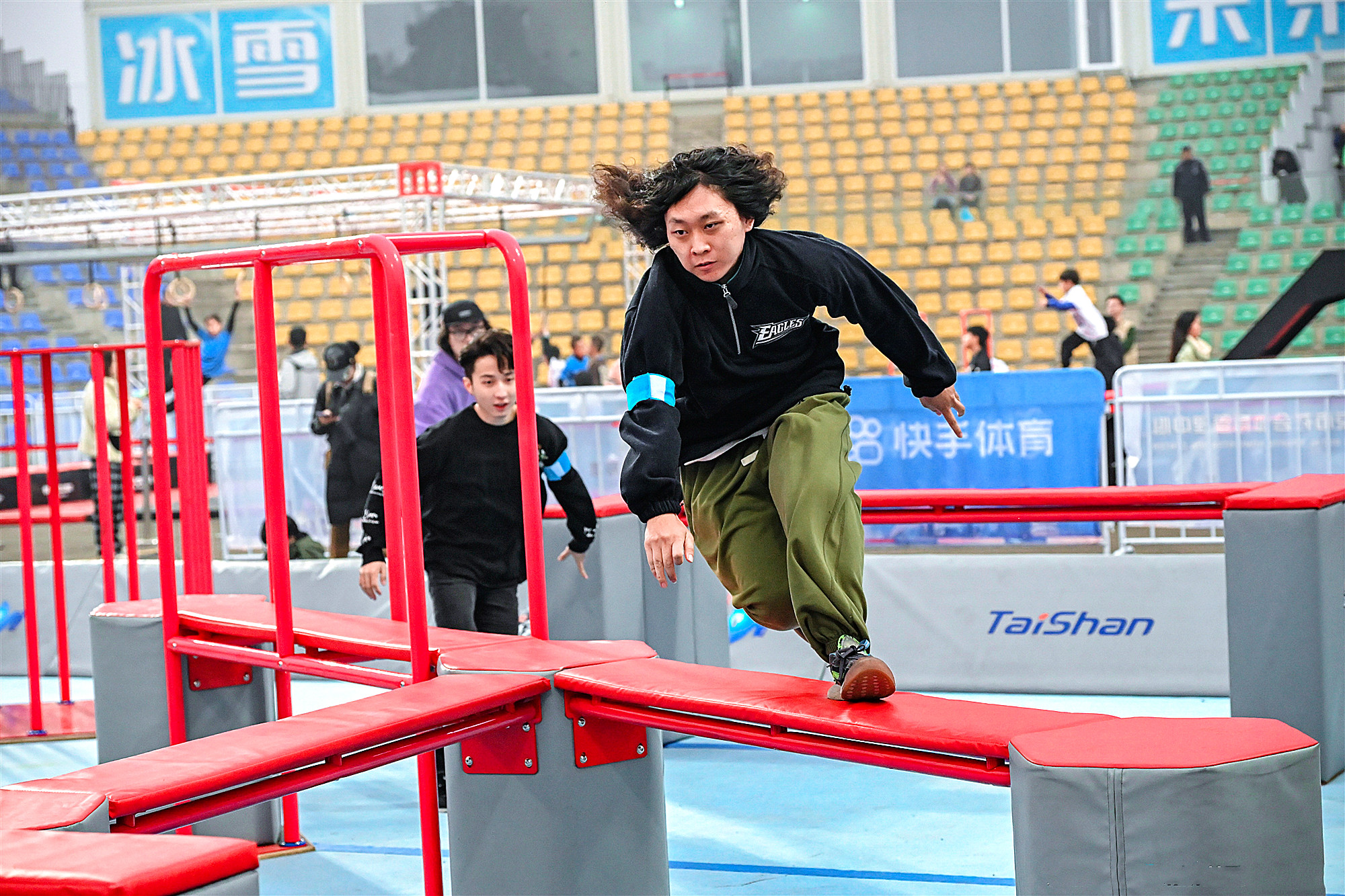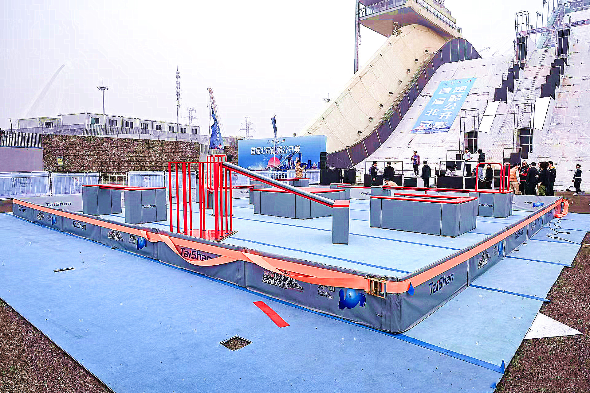 比赛以大跳台及其落地区域为赛场,搭建形成多组颜色鲜艳、各具特点的跑酷赛场。其中大跳台跑酷竞速赛道最为亮眼,赛道在大跳台本体上搭建而成,由大跳箱、滑梯、单杠、速降杆等大型专业跑酷道具组成,为目前全球最陡上升赛道,这对www.k8凯发体育安装团队和跑酷器材场地适用性,又是一次严苛检验。