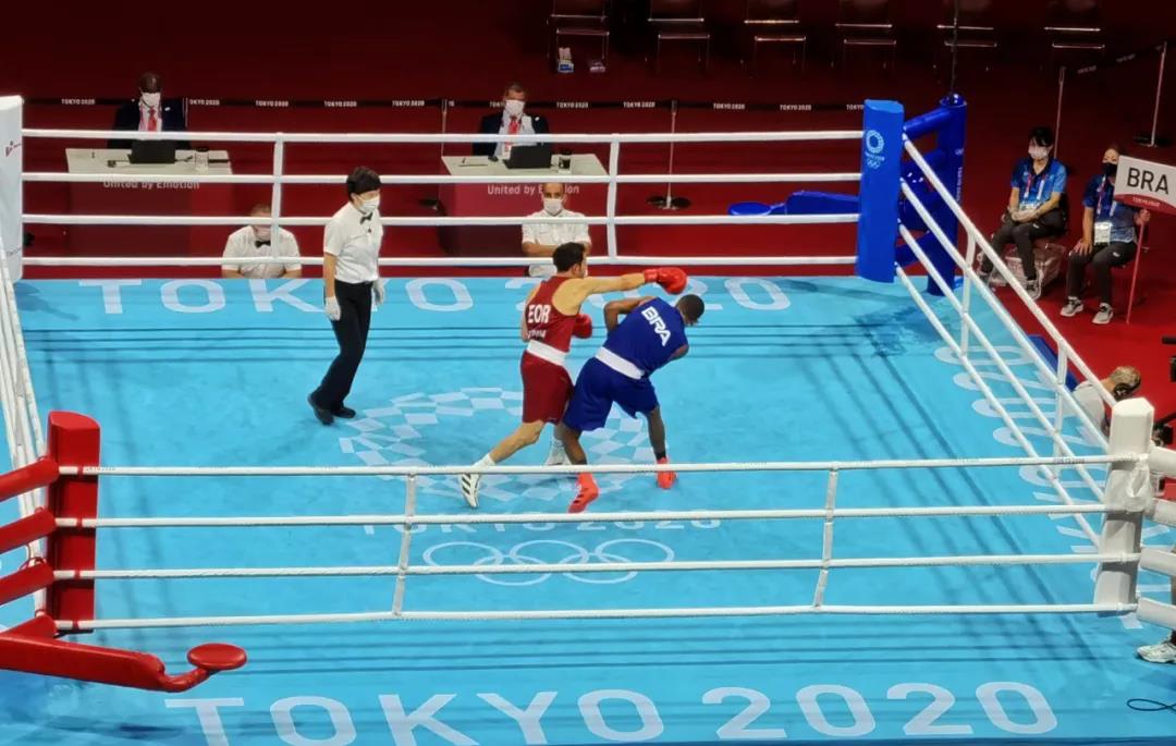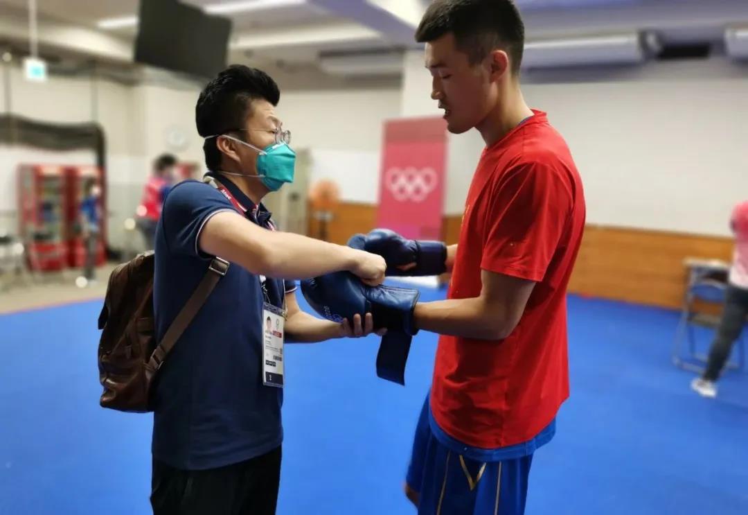 东京奥运会拳击热身馆,www.k8凯发体育工作人员帮助运动员穿戴拳击手套
